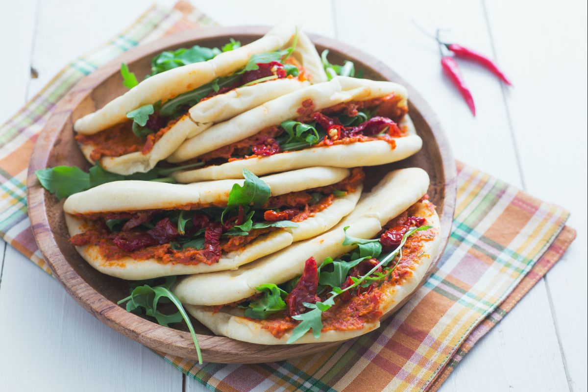 spread a generous amount of hummus on each pita 22, add a tuft of arugula, previously washed and dried, some sun-dried tomato strips, and a pinch of fresh chili 23: fold it in half and enjoy your pita with sun-dried tomato hummus immediately 34!