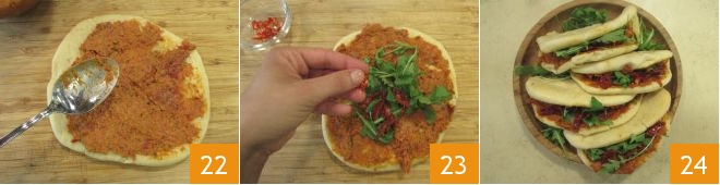 After the pita rising time, spray them with a little water and bake them in a preheated static oven at 482°F for 8 minutes on the middle shelf. Meanwhile, wash and finely chop the chili 19 and cut the other sun-dried tomatoes into strips 20. When the pita is cooked 21, you can fill them with the ingredients you have prepared: