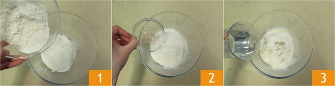 To prepare the pizza with yellow cherry tomatoes, anchovies, and capers, start with the dough. Pour the flours 1 and crumbled yeast 2 into a bowl. Add the water a little at a time 3,