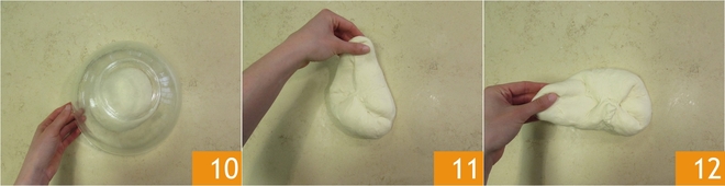 At this point, cover it with the clean bowl and leave it on the counter for about ten minutes 10. After this time, give it a fold. Imagine the sphere is divided into 4 parts, take each end, stretch it gently 11 and fold it toward the center 12.