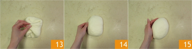 Repeat this operation for all 4 ends 13, then flip the dough 14 and shape it into a sphere 15.