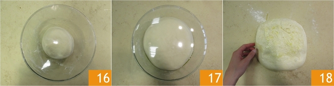 Transfer the formed dough into an oiled bowl, cover with plastic wrap 16, and let it rise until it doubles in size, which will take about 2 hours at room temperature 17. After the rising time, the dough will be nice and puffy, so transfer it to a lightly floured work surface 18