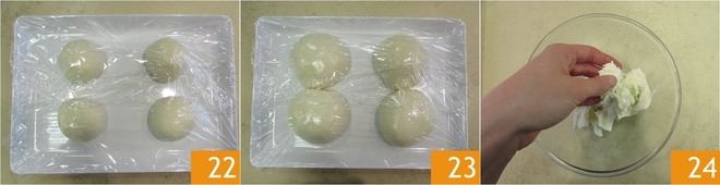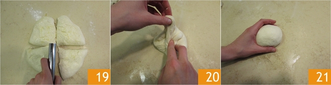 and divide it into 4 portions of about 7 oz each 19. As done before, bring the edges of the dough toward the center 20 and shape each ball into a sphere 21.
