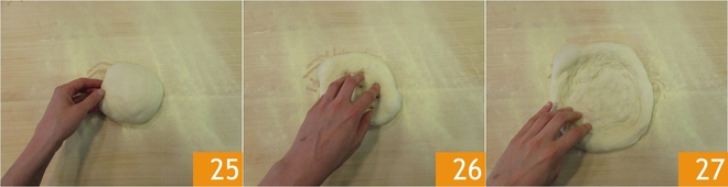 When the balls are ready, take the first one, transfer it to a floured surface 25 and press it from the center with your fingertips 26. Gently spread it while leaving the outer part thicker 27, so that a crust forms during baking.