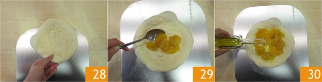 Move the dough onto a peel, being careful not to damage it 28. Arrange the cherry tomatoes in the center 29 and season with oil 30