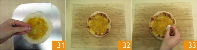 and salt. Bake and let it cook for about ten minutes. Remove the pizza with the peel and transfer it to a cutting board 32, garnish it with the shredded mozzarella 33,