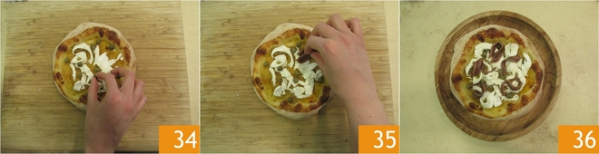 the capers 34, and the anchovies drained of oil 35. Proceed in this way for all the other pizzas and enjoy them 36.