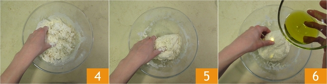 while kneading with your hands 4. Once all the water has been added and the dough begins to take shape 5, pour in the oil in a thin stream 6,
