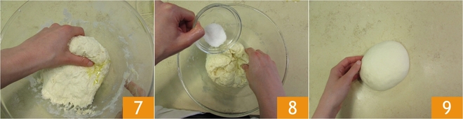 continuing to knead 7. When it starts to absorb, add the salt 8 and continue kneading until the dough is smooth and homogeneous, then transfer it to the work surface and knead it for a few more minutes 9.