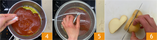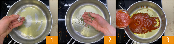 To prepare the pizzaiola-style provola, start with the sauce: heat a splash of oil with a clove of garlic 1 and the oregano 2, then pour in the tomato passata 3.