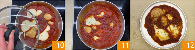 Cover again with the lid 10 and continue to cook over very low heat for about 3–5 minutes without stirring. The provola should melt without tearing apart 11. Serve your pizzaiola-style provola immediately, garnished with extra oregano to taste 12!