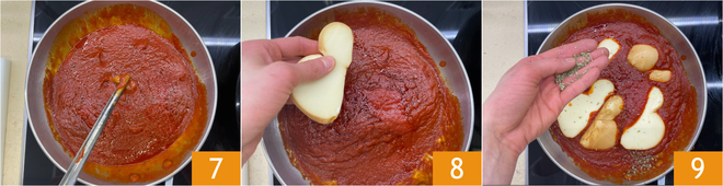 After the cooking time, remove the garlic 7 and lay the provola slices into the sauce 8, then add a little more oregano 9.