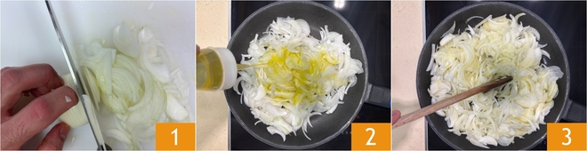To prepare the plin stuffed with Neapolitan ragù, start with the ragù: peel and finely slice the onions 1. Place the onions in a pan, add the oil 2, and turn on the heat. Stew the onions over low heat for about 20 minutes 3.