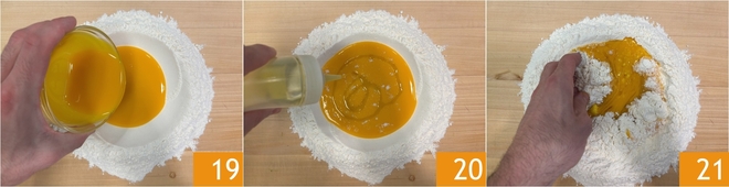 In the meantime, you can work on the fresh pasta: arrange the flour in a well on the work surface, then pour the yolks in the center 19. Add salt and oil 20 and start incorporating the ingredients with your hands 21.