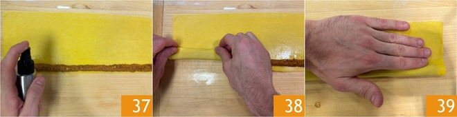 Fold the sheet to strengthen it 34 and pass it through the machine again, gradually reducing the thickness until you reach the thinnest setting 35. Place the sheet on the work surface and squeeze the filling along its entire length 36.