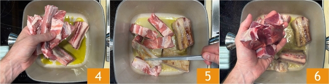 In the meantime, prepare the meat: cut the beef brisket, then chop the pork neck and shoulder into smaller pieces. You can leave the ribs whole. Salt the meat and brown it in a large pan with hot oil 4. Turn the meat pieces on all sides so that a nice crust forms 5. If the pan is not large enough, you can remove the toasted meat to make room for the remaining pieces 6, and then add them back later.