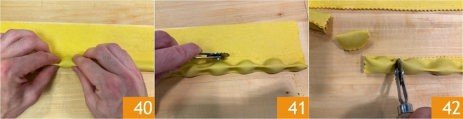 Pinch the sheet at the sides of the filling to form the plin 40, then cut them with a fluted wheel first along the length 41 and then to separate each one 42. Continue this way until all the dough is used up.