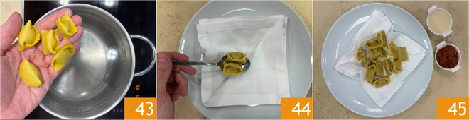 Now bring a pot of salted water to a boil and cook the plin for a couple of minutes 43. Drain the ravioli directly onto the napkin you have placed on a warm plate 44. Serve your plin stuffed with Neapolitan ragù with the reserved ragù or with a sauce based on cream and Parmesan 45!