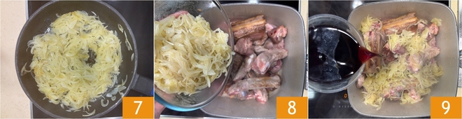 Meanwhile, the onions will be well softened 7, so pour them into the pan with the meat 8. Sauté everything for a few minutes to blend the flavors, then deglaze with red wine 9.