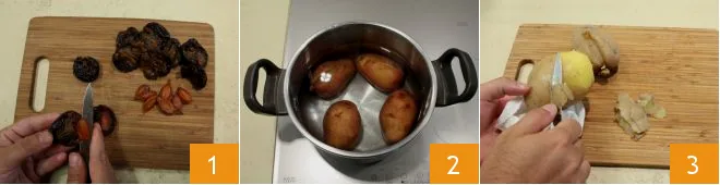 To prepare the plum dumplings, start by taking the plums and pitting them with a knife 1. If you are using rather dry dried plums, soak them in warm water to rehydrate, then gently squeeze them and only then pit them. After this procedure, set the plums aside. Wash the potatoes thoroughly under fresh running water and boil them whole with the skin in plenty of salted water 2. After 40-45 minutes, check if the potatoes are cooked by pricking them with a fork; if the potatoes are soft and well-cooked, turn off the heat and gently drain them from the water; then peel them while still hot 3.