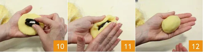 Divide the dough into 12 equal parts weighing 60 grams each and form balls that you will then flatten in the palm of your hands, thus obtaining discs. Once this step is complete, place a pitted plum in the center of each disc in which you will also place half a sugar cube (or a small teaspoon of sugar) 10. Gently close each disc with your hands 11 until you form equally sized balls 12.