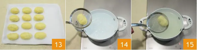 Repeat the operation and, when you have finished, place the plum dumplings you have obtained on a tray lined with parchment paper 13. When the water has reached a boil, boil the dumplings 14 and drain them as they float to the surface 15;