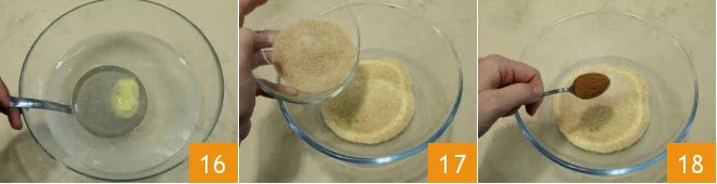 then cool them in cold water, immersing them with a skimmer 16. Now proceed to the preparation of the breading: in a bowl pour the breadcrumbs, brown sugar 17, cinnamon 18, then mix them well with a spoon.