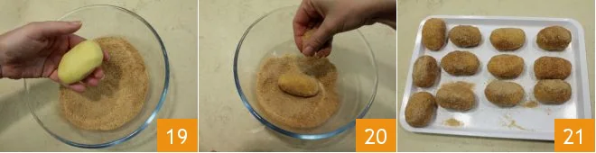 Gently pass the plum dumplings in the breading you have obtained 19, making sure it adheres well evenly 20. Repeat the operation and place the breaded dumplings on a tray 21.