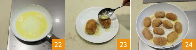 Finally, put a non-stick pan on the stove with the butter 22; once melted, you can decide whether to sprinkle the plum dumplings with the melted butter 23 or sauté them in the pan until they are golden brown 34. Another variant consists of browning the breadcrumbs with the butter and cinnamon, then tossing the dumplings in it for a few seconds to flavor them. Serve the plum dumplings hot immediately.