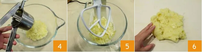 Subsequently, pass them through a food mill or potato ricer 4 and place the puree in the stand mixer. Add the room temperature butter in pieces and start the paddle attachment 5 (if you don't have a stand mixer, work the dough on a work surface with your hands); when you have obtained a homogeneous mixture, transfer the potato puree to a work surface 6.