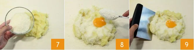 Then add the grated Parmigiano Reggiano 7, the egg yolk, and the flour 8; gently mix everything with a spatula for 5-6 minutes at most without kneading excessively 9, until you get a soft and consistent mixture. If the dough is too soft or sticky, add another tablespoon of flour (the result depends a lot on the type of potatoes you used). Meanwhile, put a pot with plenty of salted water on the stove, which will be used for cooking the dumplings.