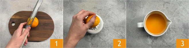 To prepare the mandarin plumcake, start by grating the zest of the citrus fruits, which you will set aside for a moment 1. Then squeeze the juice 2 and weigh 60 g (about 1/4 cup) to use for the batter 3.