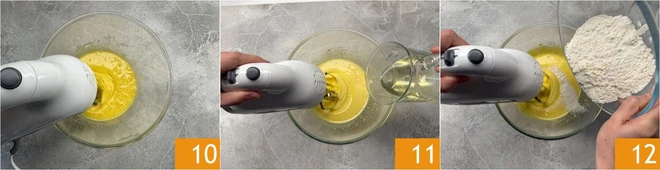 Work with the electric mixer for 5 minutes 10, then gradually add the oil in a slow stream 11 and continue to mix until fully incorporated. Then, gradually add the dry ingredients 12.