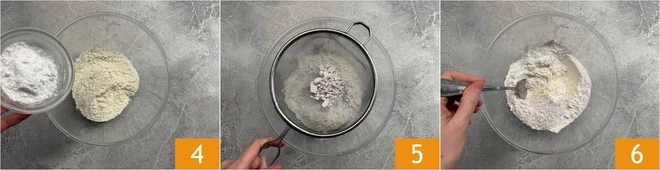 Take care of the dry ingredients: in a bowl, combine the cornstarch with the flour 4 and sift in the baking powder 5. Mix and set aside 6.