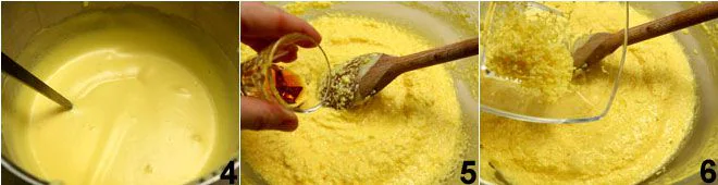 Add the beaten eggs to the butter and sugar mixture, continuing to mix until you get a smooth and homogeneous cream 4. Then add the rum 5, the grated zest of one lemon 6.