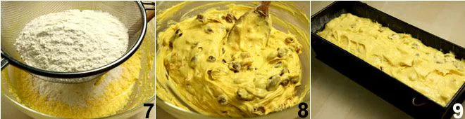 Then add the sifted baking powder and flour 7. Add the seeds of the vanilla bean, the candied fruit, and 2/3 of the raisins to the batter and mix until the ingredients are completely combined 8; butter and flour a plum cake mold and pour the mixture into it 9, making sure that the batter does not exceed 2/3 of the mold. Level it with a spatula, add the remaining raisins on the surface, and bake in a preheated oven at 350°F (before taking out the plum cake, poke it with a skewer, which should come out dry).