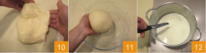 Now transfer the dough onto the work surface and work it by hand 10 just long enough to form a ball; place it in a bowl 11, cover with plastic wrap, and let it rise in the oven turned off with the light on for about 2 hours or until it has doubled in volume. While the dough is rising, you can prepare the filling cream: pour the milk into a fairly large saucepan, add the seeds from the vanilla pod 12, and bring it almost to a boil.