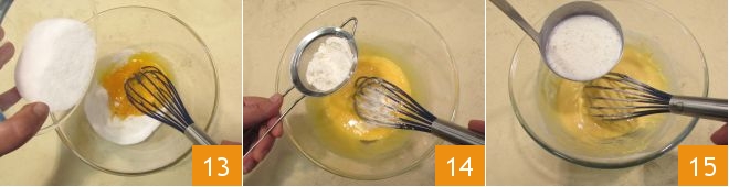 In a separate bowl, beat the egg yolks and sugar with a whisk to combine them 13, then sift the flour into the bowl 14 and beat further to combine. Add a ladle of hot milk to the egg mixture and stir to temper it 15,