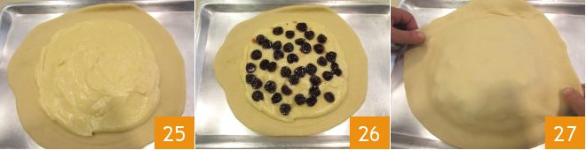 Use a spatula or the back of a spoon to spread the cream layer evenly, being careful to leave about 3/4 inch from the edge free 25. Distribute the sliced cherries over the cream 26, then gently place the second dough disk over the cream so that it covers the filling well 27.