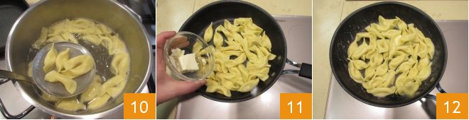 At this point, the casoncelli should also have been floating for a few minutes and will be cooked. Drain them using a slotted spoon 10 and transfer them to another pan. Add the butter 11, turn the heat back on, and let it melt slowly 12.