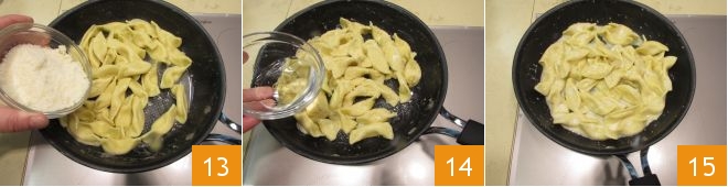 Add the Parmesan 13 and cream them by gently mixing. If the temperature is too high, add a splash of cold water 14. The casoncelli are ready 15; all that's left is to plate them.