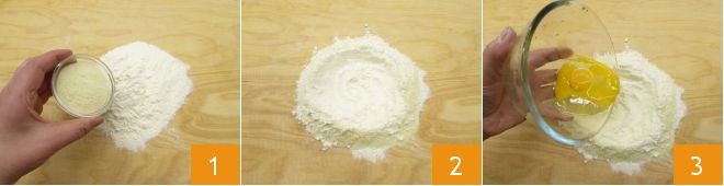 To prepare the polenta casoncelli with rabbit, first make the egg pasta. Pour the flour and semolina 1 onto a work surface, form a well 2, and place the egg and the yolk in the center 3.