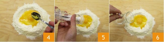 Add the oil 4, a pinch of salt 5, and the water 6.