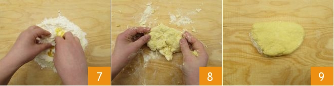 Knead with your hands 7, being careful to break the eggs well and mix everything. If the dough is too hard, you can add a bit more water. Knead 8 until you obtain a soft, elastic, and homogeneous dough. Then wrap it in plastic wrap and let it rest at room temperature for about 20-30 minutes 9.