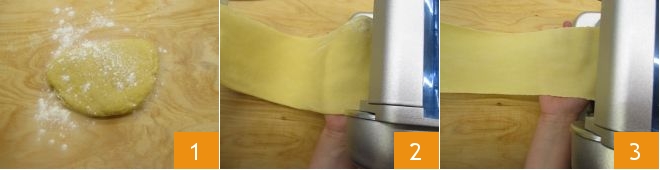 After 30 minutes, roll out the dough 1. Use a pasta machine and decrease the thickness with each pass (2-3), until you get a very thin sheet. It should be about 1/32 to 1/16 inch thick.