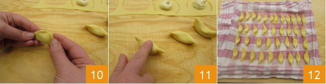 sealing the edges well 9. Then turn it over and gently press in the center 11 to create an impression. Continue in this way with all the others 12.