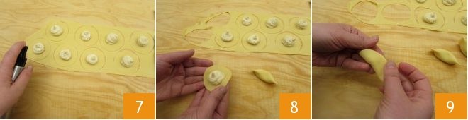 At this point, use a mister to moisten the surface of the pasta 7, this will help them seal better so the filling won't come out. Fold the casoncelli in half (8-9),