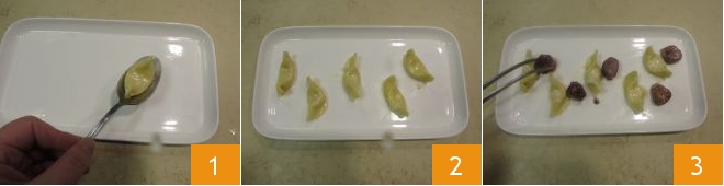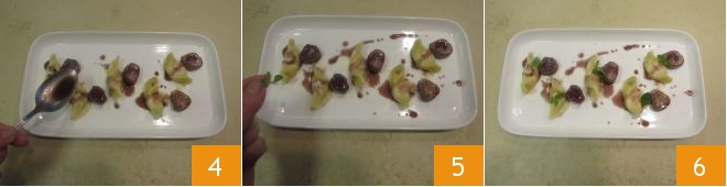 Now that everything is ready, it's time to plate. Place the casoncelli 1, add a bit of their sauce 2, arrange the rabbit cubes nearby 3,