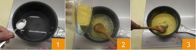 At this point, prepare the polenta. Heat the water, salt it 1, and when it starts to boil, pour in the flour gradually 2 and cook, stirring 3 with a wooden spoon for about 40 minutes,