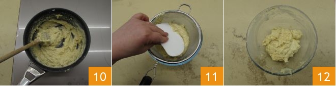 Pour it slowly to better adjust the final consistency 10. Taste and adjust with salt and pepper as needed. Place a strainer over a bowl and transfer the polenta into it. Then sieve it 11 to obtain a smoother filling 12, then transfer it into a piping bag and let it cool for about half an hour.
